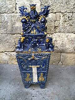 Christmas gifts (including a fantastic sake bottle with a dragon that FH would have LOVED--the head was the spout, and the body looked as if it writhed in and out of the body of the pitcher) but luckily for my finances, they didn't take plastic and I didn't have enough yen to get what I wanted. The pottery was COMPLETELY different from the porcelain in my area, much more rustic, much more "hand made", a lot like the Seagrove pottery FH and I saw on our honeymoon. I really loved it! Then we went to a store that specialized in shisa, the dogs that guard everything from homes to temples to hotels. The two dogs sit on either side of the entrance (they look a lot like temple dogs, but are not the same). The male has an open mouth to capture the good spirits, and the female has a closed mouth to hold the good spirits in and protect them.